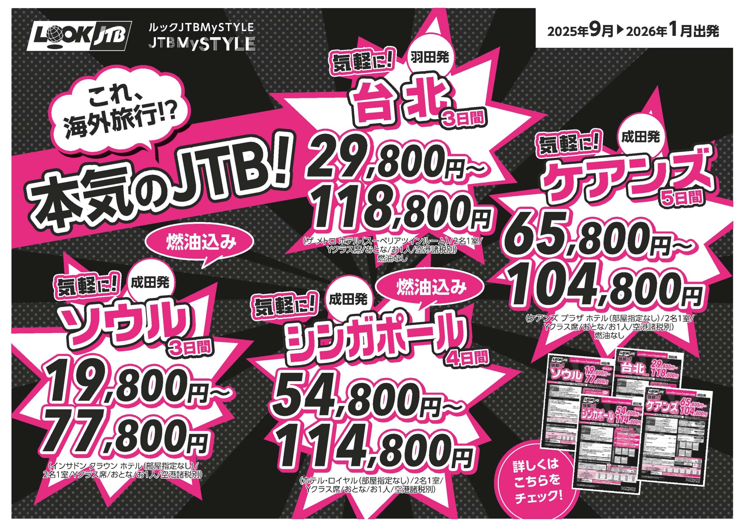 - 取扱商品により旅行取引条件書(略:旅行条件書)に基づいて旅行業務取扱料金が発生いたします。