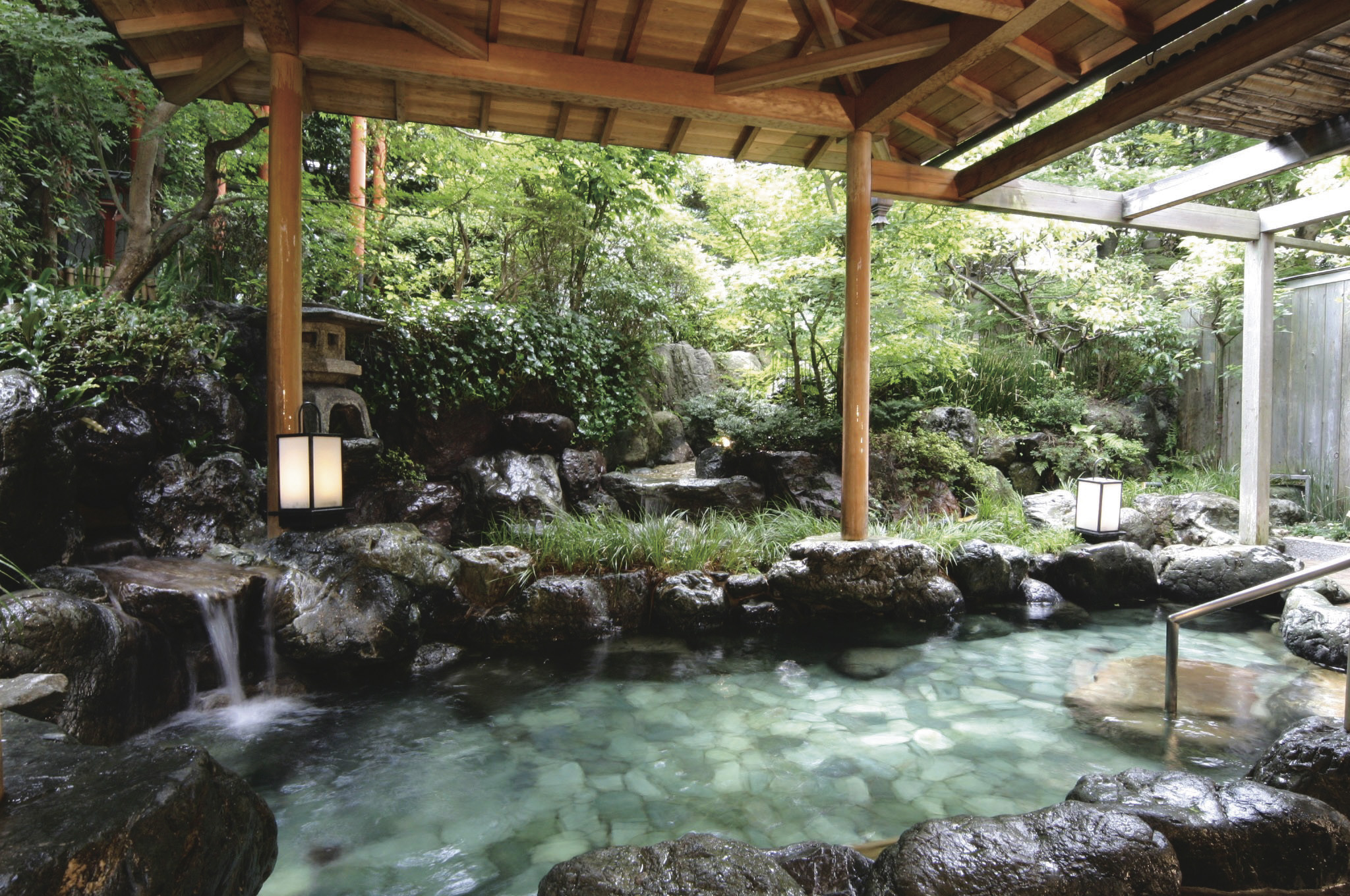 駅前の立地ながら、庭園露天風呂は岩風呂と石風呂があり、夜と朝の男女入替で両方楽しめます。